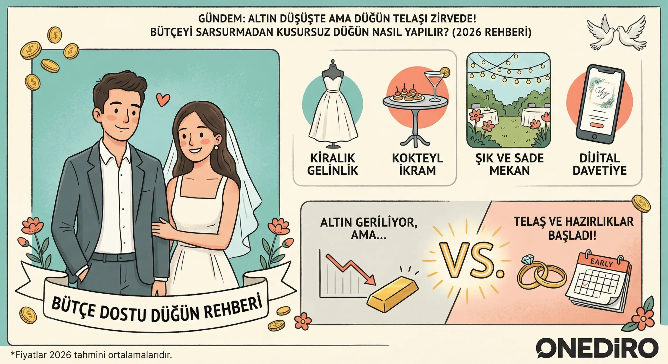 Havalar ısındı, bahar geldi ve beklenen o sezon resmen açıldı: Düğün Sezonu! Şu sıralar evlilik arifesindeki çiftlerin ve ailelerin gözü kulağı tek bir yerde; altın fiyatlarında. Gram altının son günlerde sınırlı bir düşüş eğilimi göstererek 6.660 TL bandına çekilmesi yüreklere minik bir su serpmiş olsa da, kabul edelim ki fiyatlar geçen yıla göre hala çok yüksek. Üstelik küresel belirsizlikler yüzünden piyasaların aniden yön değiştirebilme ihtimali, “Acaba daha düşer mi, fırlar mı?” stresiyle hepimizi ekran başına kilitliyor.